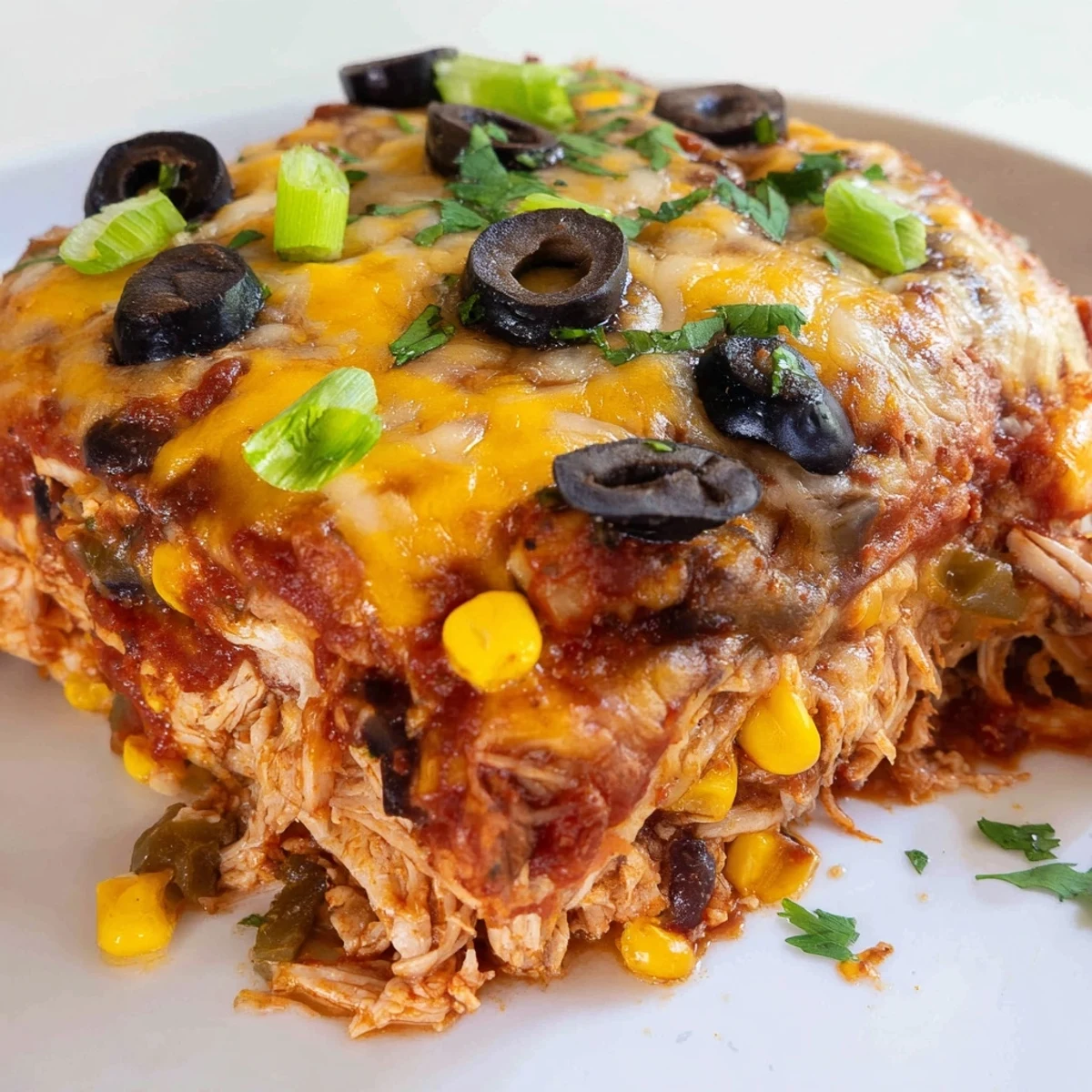 This Tex-Mex inspired casserole brings together tender shredded chicken, black beans, corn, and aromatic spices between layers of soft tortillas. Rich red enchilada sauce and a generous amount of melted Mexican cheese create the perfect balance of savory and gooey textures. The dish bakes up bubbly and golden in under an hour, making it ideal for weeknight dinners or casual gatherings.