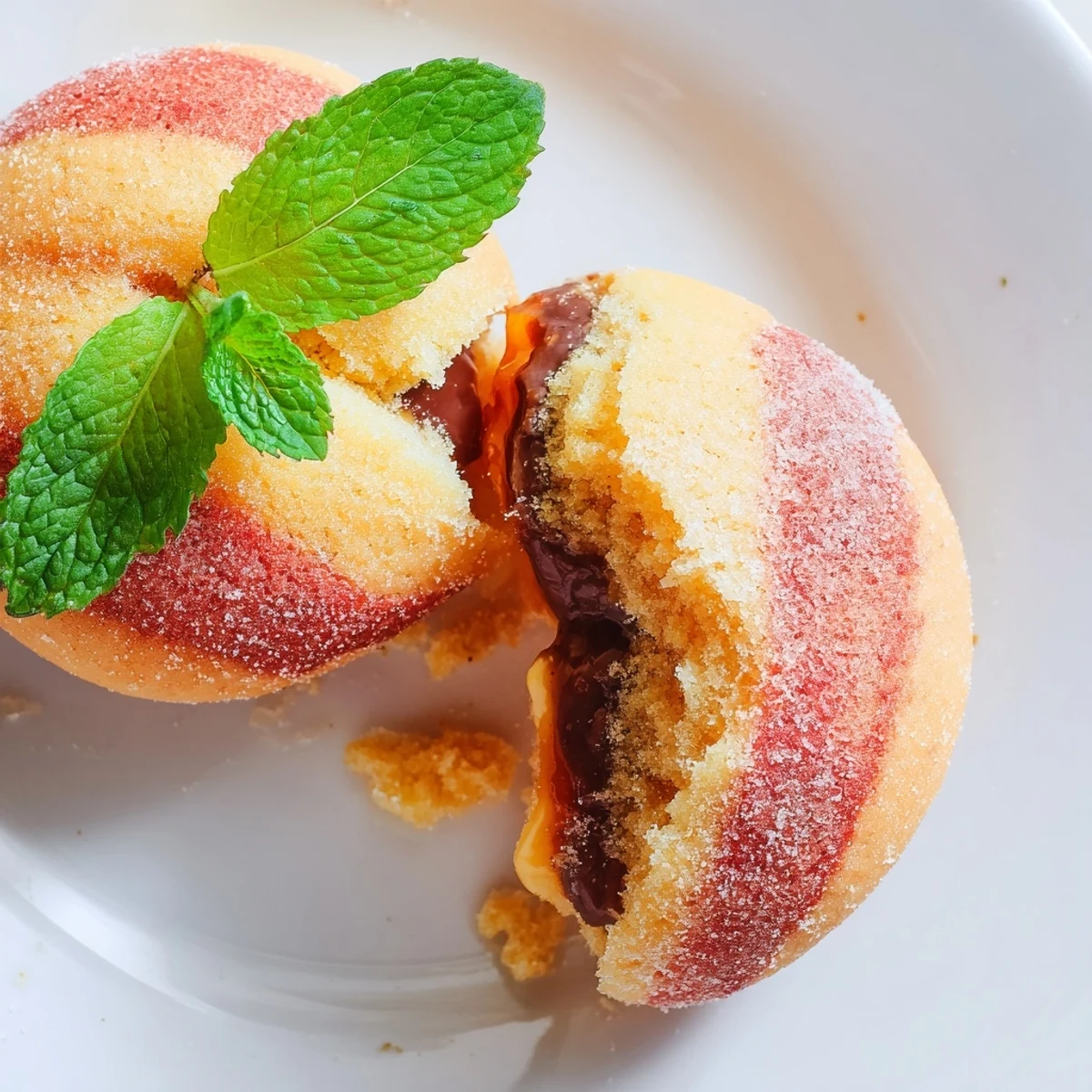 Create stunning peach-shaped cookies inspired by Italian baking traditions. These delightful sandwich treats combine soft vanilla-lemon dough with a luscious filling of melted dark chocolate and peach or apricot jam. Each cookie gets hand-painted with natural food coloring to achieve that authentic peach blush, then rolled in sparkling sugar for the perfect finish. The process involves baking tender rounds, creating a small cavity, filling with the chocolate-jam mixture, and sandwiching pairs together. A final touch with mint leaves adds realistic stems. These decorative cookies shine at parties, holidays, and special gatherings.
